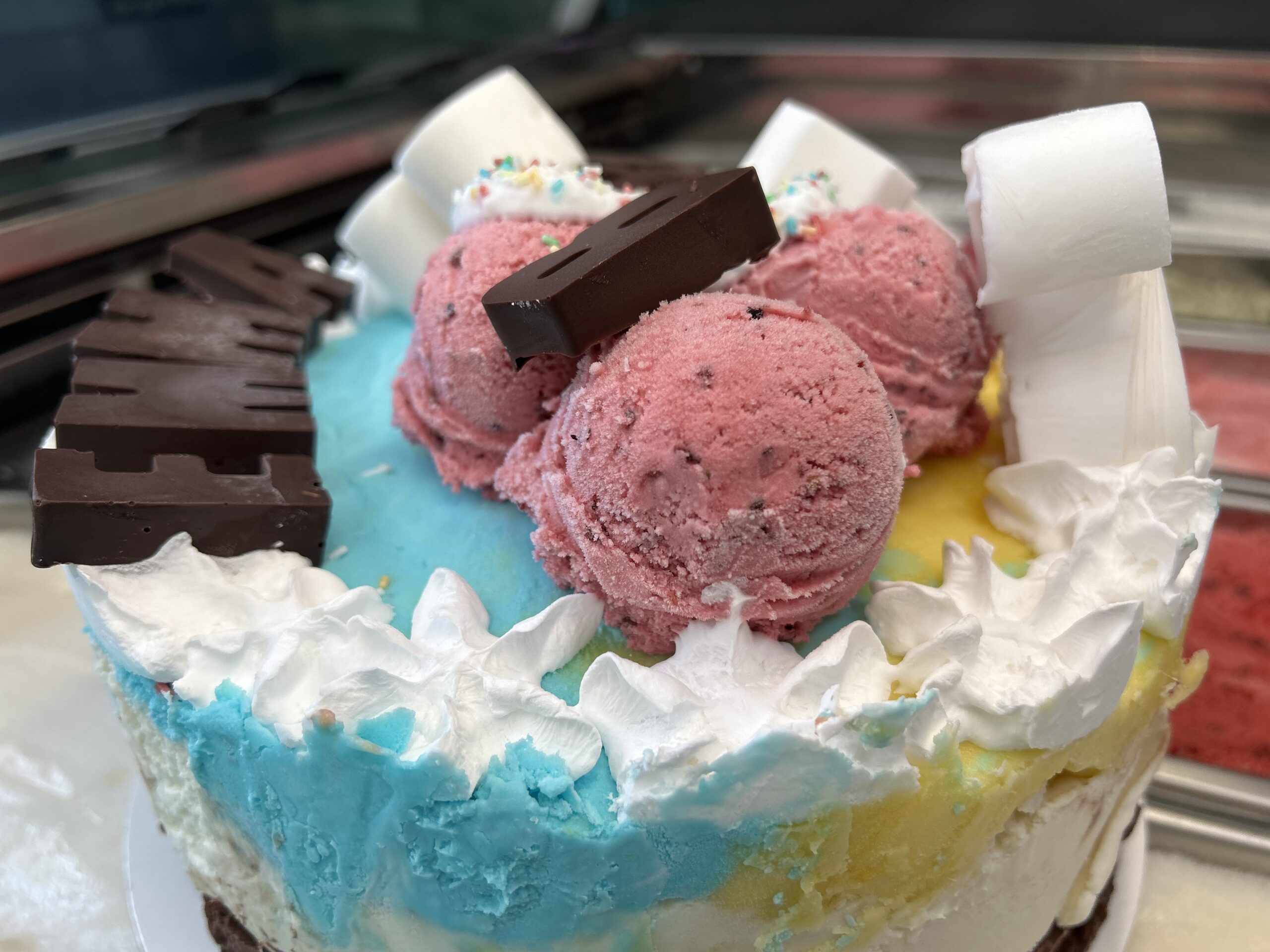 Vor dem Anschneiden mind. 10 Minuten draussen stehen lassen. Die Eis-Torte kann mind. 30 Minuten auf dem Tisch stehen und kann immer wieder eingefroren werden.